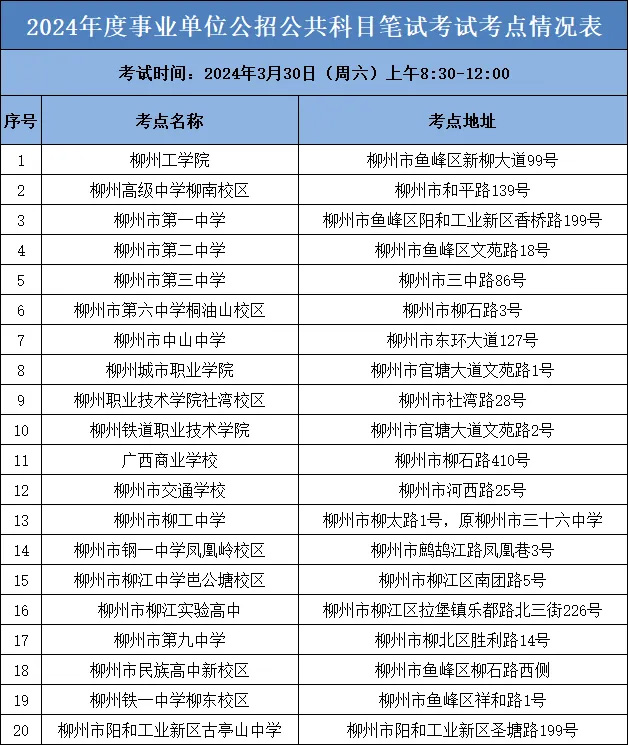 今年,25009名考生將在柳州市參加2024年度柳州市事業(yè)單位公開考試招聘工作人員公共科目筆試,柳州市考區(qū)共設20個筆試考點。