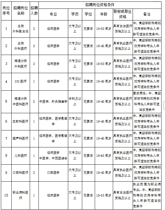 一、招聘崗位和人數(shù)本次公開招聘涉及崗位10個,各類(級)衛(wèi)生專業(yè)技術(shù)人員共15人,詳見下表。
