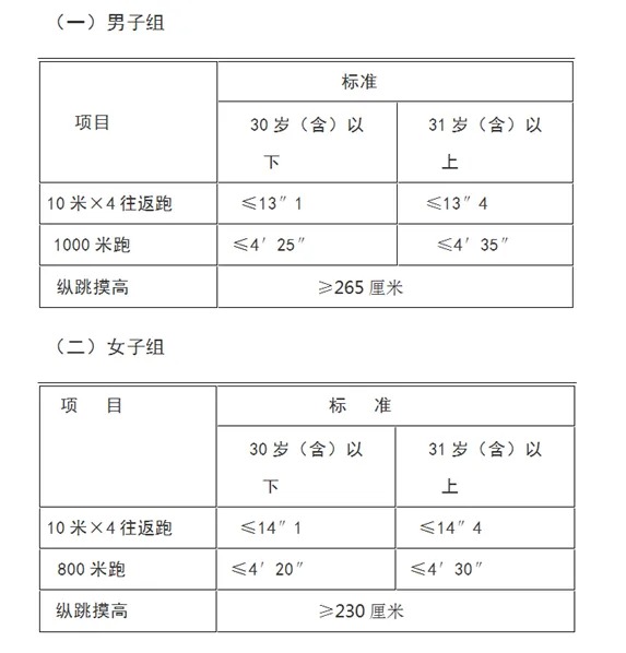 報考人員須參加全部三項體能測評,全部達標方為合格,如放棄一項則視為不合格,體能測評合格的方可進入下一環(huán)節(jié)。