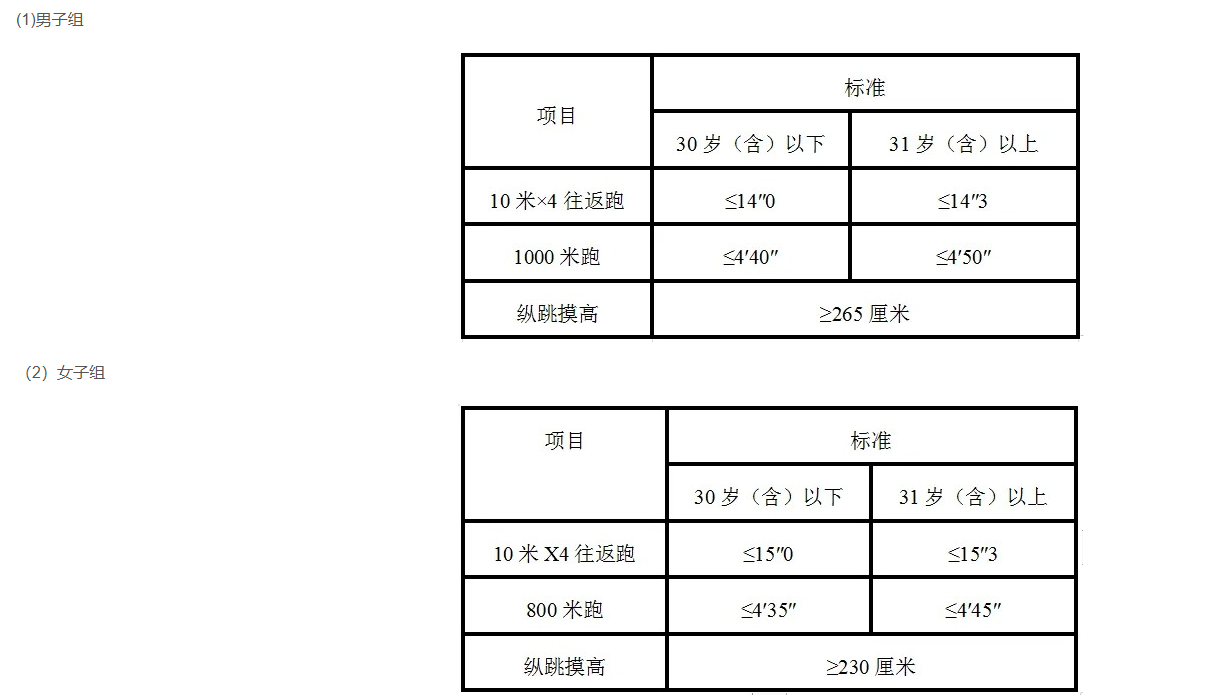 3.參照《關(guān)于印發(fā)公安機關(guān)錄用人民警察體能測評項目和標準(暫行)的通知》(人社部發(fā)〔2011〕48號)的項目及測試規(guī)則,結(jié)合《公安民警體育鍛煉達標手冊》成績標準,體能測評的項目和標準如下: