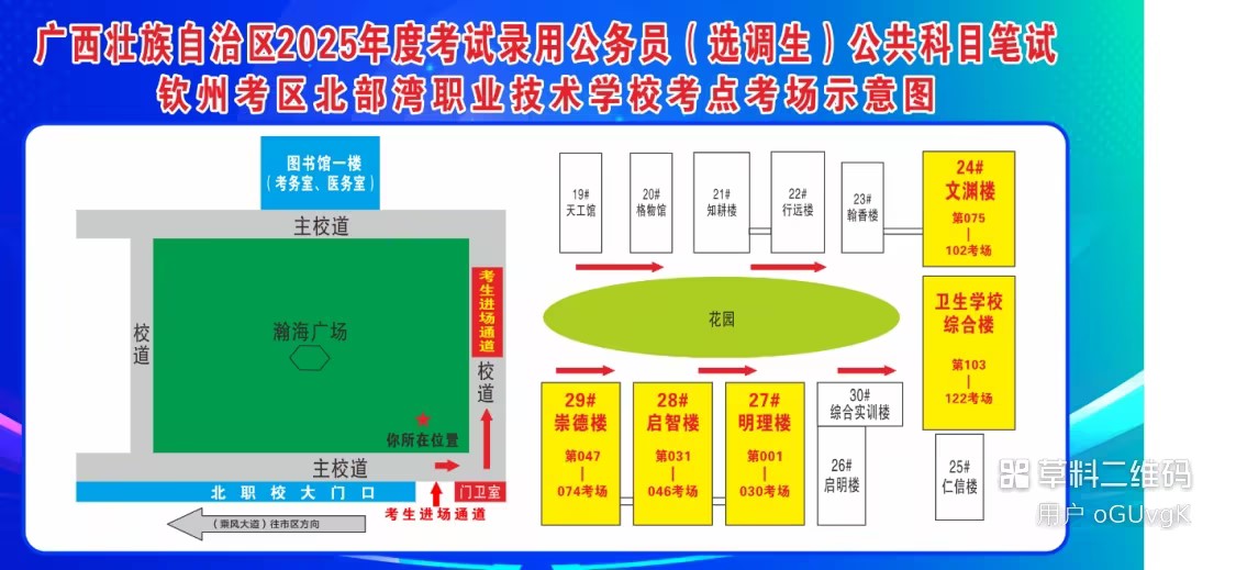 欽州考區(qū)共設(shè)兩個(gè)考點(diǎn),分別為北部灣大學(xué)考點(diǎn)、北部灣職業(yè)技術(shù)學(xué)??键c(diǎn)。(考點(diǎn)地址和具體考場(chǎng)安排請(qǐng)掃附后的二維碼查看)
