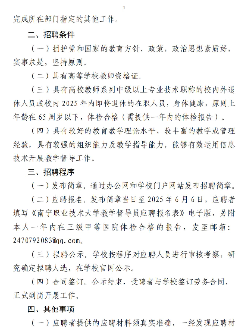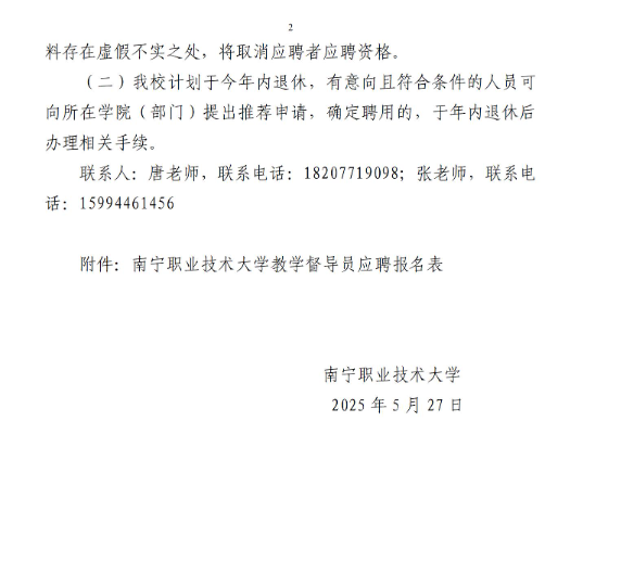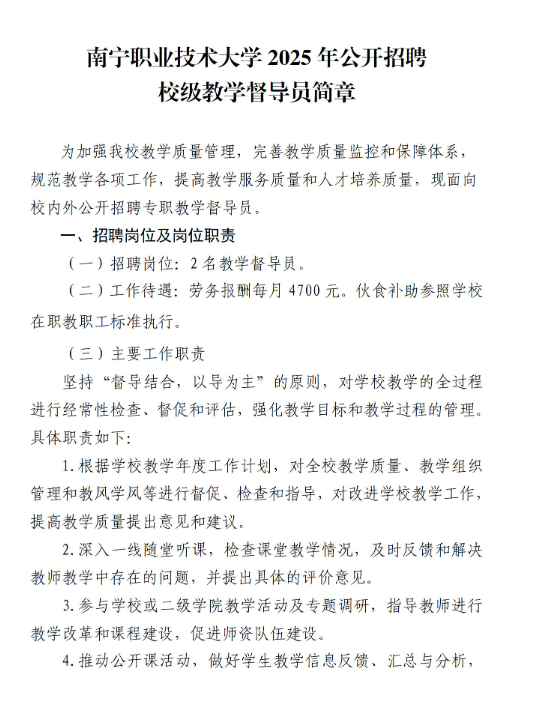 2025年廣西南寧職業(yè)技術(shù)大學(xué)招聘校級(jí)教學(xué)督導(dǎo)員2人