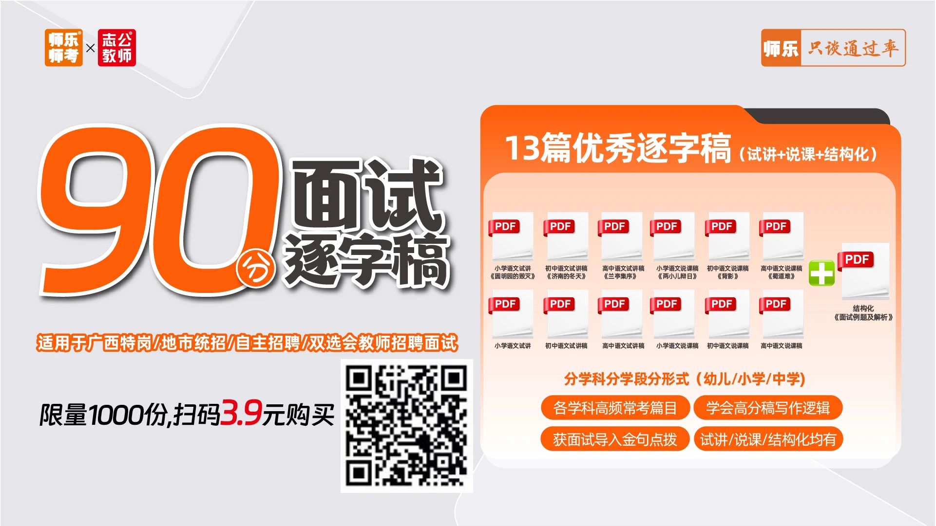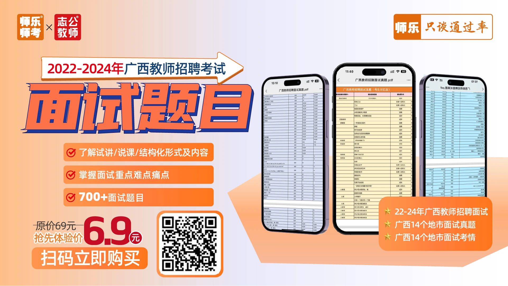 ??寫作邏輯+面試導(dǎo)入金句點(diǎn)撥 ?含13+篇試講+說(shuō)課+結(jié)構(gòu)化 搶先體驗(yàn)價(jià):6.9元 ??14地市教招面試zhen題 了解試講/說(shuō)課/結(jié)構(gòu)化形式及內(nèi)容 面試禮儀課 ??面試禮儀干貨介紹 正反面案例直觀對(duì)比 ??著裝、問(wèn)候、儀態(tài)、言談禮儀等事項(xiàng)介紹 【師樂(lè)】廣西教招備考群 ??最新公告 備考資料 ??刷題打卡 考試交流