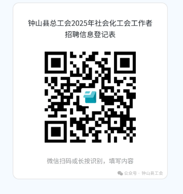 2.報(bào)名方式:采取網(wǎng)上報(bào)名方式報(bào)名。報(bào)名時(shí)間截止前,有意者請根據(jù)附件1填寫個人簡歷,并用微信掃描下方二維碼打開小程序填寫《鐘山縣總工會2025年社會化工會工作者招聘信息登記表》,上傳個人簡歷、身份證掃描件、學(xué)歷證書掃描件、學(xué)信網(wǎng)教育部學(xué)歷證書電子注冊備案表、榮譽(yù)證書掃描件、發(fā)表文章等佐證材料,逾期不再接收任何報(bào)送材料。