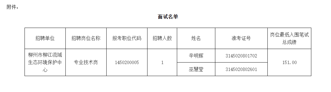(三)成績公布:面試成績將于面試結(jié)束后當(dāng)天在柳州市生態(tài)環(huán)境局一樓公示欄進(jìn)行公示,并同步發(fā)布于柳州市生態(tài)環(huán)境局網(wǎng)站(http://sthjj.liuzhou.gov.cn),請(qǐng)考生自行查看。