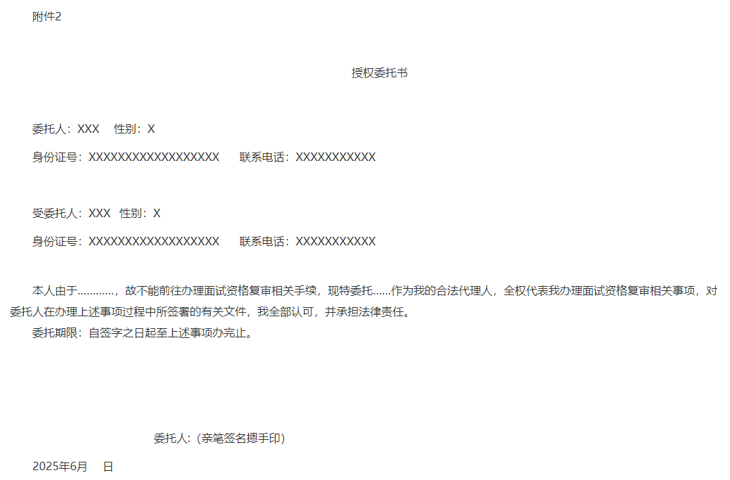 (二)面試資格復(fù)審一般應(yīng)由報(bào)考人員本人參加。因特殊原因需由他人代為參加面試資格復(fù)審的,須由報(bào)考人員出具委托書(委托書應(yīng)有委托人、受托人的姓名和身份證號碼,委托原因和代辦事項(xiàng),委托人親筆簽名等,詳見附件2),經(jīng)面試復(fù)審單位同意后,可以委托代理。