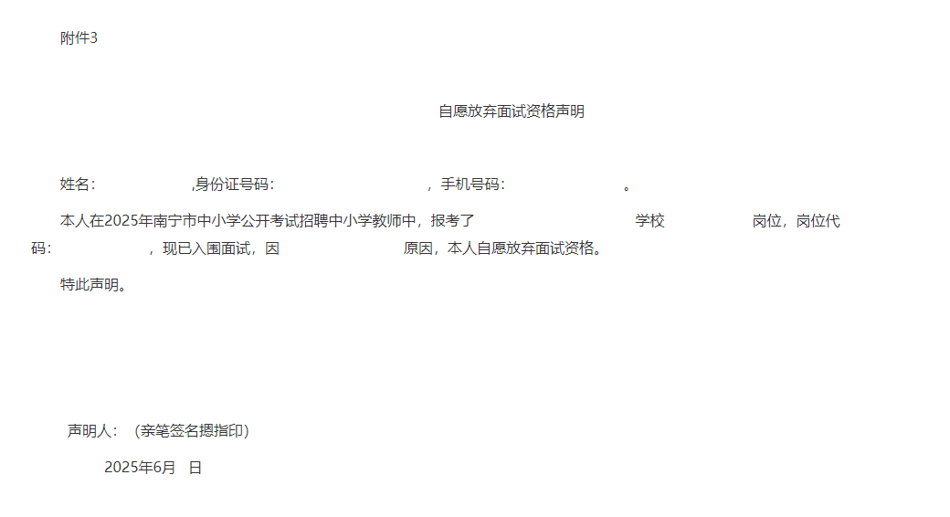 (四)放棄面試資格的報(bào)考人員,應(yīng)及時(shí)向面試資格復(fù)審單位提供書面放棄面試資格說明材料(詳見附件3,包含:報(bào)考單位、崗位名稱和代碼、注明身份證號碼、手機(jī)號碼、本人簽名捺手印,材料可傳真或掃描發(fā)送郵箱:rs8223408@126.com),否則按相關(guān)規(guī)定處理。