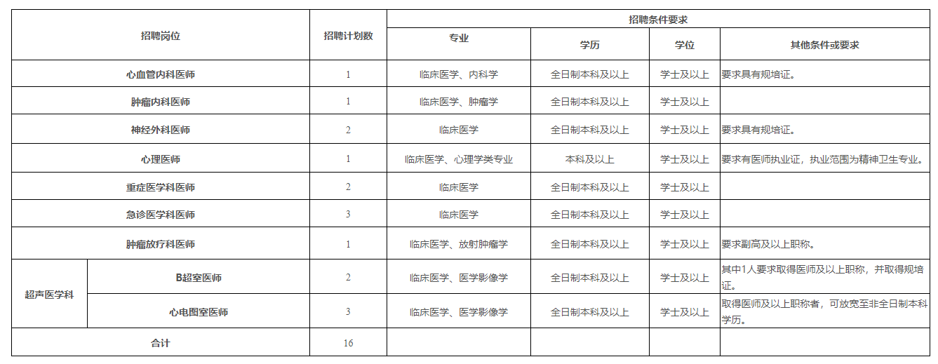 注:初中級職稱應聘人員原則上年齡要求為35周歲及以下;如為副高以上職稱,年齡可放寬至45周歲;學歷層次高者優(yōu)先。醫(yī)師崗位中如要求具有規(guī)培證條件的是指已取得規(guī)培合格證書(含通過規(guī)培結業(yè)考試未領合格證書)或已取得中級及以上職稱人員。
