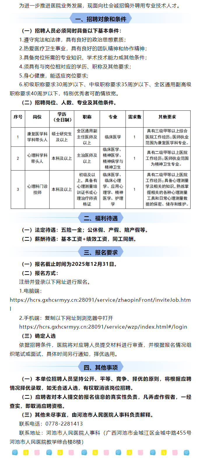 2025年河池市人民醫(yī)院公開招聘康復醫(yī)學科、心理科專業(yè)技術(shù)人才