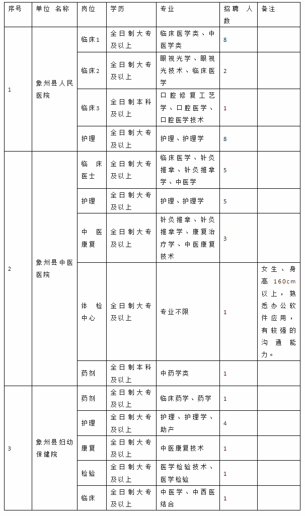 因工作需要,根據(jù)相關(guān)規(guī)定,我單位擬面向社會(huì)公開(kāi)招聘見(jiàn)習(xí)人員42名,其中象州縣人民醫(yī)院19人、象州縣中醫(yī)醫(yī)院15人、象州縣婦幼保健院8人?,F(xiàn)將有關(guān)事項(xiàng)通知如下: