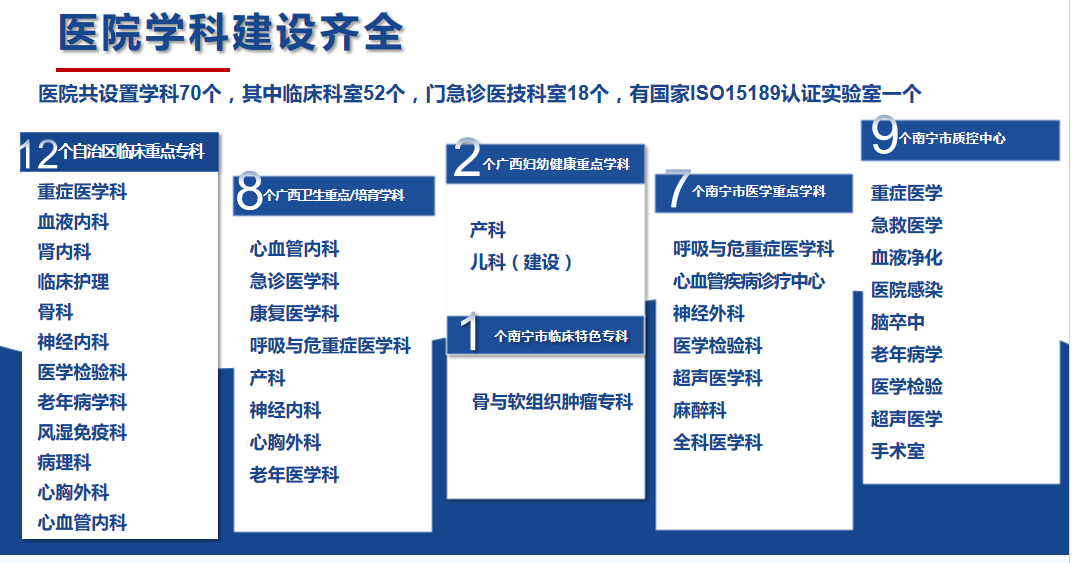 南寧市第一人民醫(yī)院(南寧市兒童先天性心血管疾病研究所、南寧市呼吸道疾病研究所、廣西醫(yī)科大學(xué)第五臨床醫(yī)學(xué)院、廣西醫(yī)科大學(xué)第五附屬醫(yī)院)始建于1914年,是一家擁有百年歷史的國(guó)家三級(jí)甲等綜合性醫(yī)院。醫(yī)院設(shè)有52個(gè)臨床病區(qū),18個(gè)門診醫(yī)技科室,總開放床位1912張(含分院)。醫(yī)院是國(guó)家高級(jí)認(rèn)知中心建設(shè)單位及國(guó)家神經(jīng)介入建設(shè)中心、國(guó)家ISO15189醫(yī)學(xué)檢驗(yàn)認(rèn)證機(jī)構(gòu),國(guó)家聯(lián)盟中心認(rèn)證的胸痛中心、卒中中心;擁有廣西臨床重點(diǎn)專科(含培育)12個(gè)、自治區(qū)醫(yī)療衛(wèi)生重點(diǎn)學(xué)科(含培育)8個(gè)、自治區(qū)婦幼健康服務(wù)重點(diǎn)學(xué)科(含建設(shè))2個(gè)、南寧市醫(yī)學(xué)重點(diǎn)學(xué)科7個(gè)、南寧市臨床特色優(yōu)勢(shì)???個(gè),南寧市質(zhì)控中心9個(gè)。醫(yī)院是國(guó)家衛(wèi)健委創(chuàng)面修復(fù)能力建設(shè)和繼續(xù)教育中心教學(xué)基地、國(guó)家級(jí)住院醫(yī)師規(guī)范化培訓(xùn)培訓(xùn)基地,廣西醫(yī)科大學(xué)碩士研究生培養(yǎng)基地,同時(shí)是暨南大學(xué)共建醫(yī)學(xué)教育基地、第十批廣西博士后創(chuàng)新實(shí)踐基地;醫(yī)院還具備國(guó)家藥物臨床試驗(yàn)機(jī)構(gòu)資質(zhì)(含I期研究室);醫(yī)院醫(yī)學(xué)實(shí)驗(yàn)中心獲批廣西科技廳重點(diǎn)實(shí)驗(yàn)室“廣西智慧精準(zhǔn)醫(yī)學(xué)實(shí)驗(yàn)室”,是南寧市衛(wèi)健系統(tǒng)唯一的省級(jí)重點(diǎn)建設(shè)實(shí)驗(yàn)室。2019年在市委市政府支持下,成立南寧市第一人民醫(yī)院醫(yī)療集團(tuán)?,F(xiàn)有27家成員單位,形成“1+4+22”(中心醫(yī)院+4家二級(jí)醫(yī)院+22家基層衛(wèi)生及養(yǎng)老機(jī)構(gòu))一體化格局,推行“三二一”運(yùn)營(yíng)管理模式,逐步構(gòu)建全生命周期健康管理鏈。