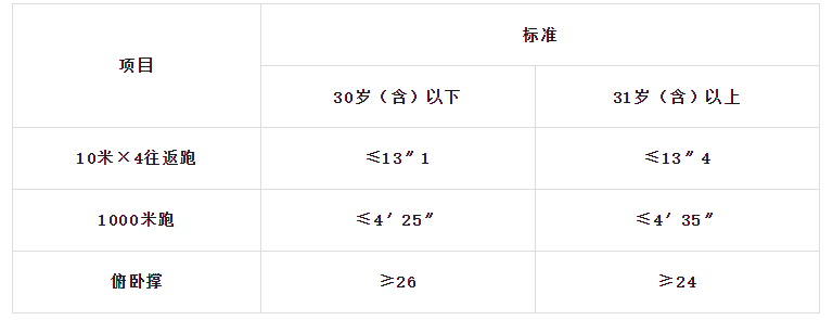 體能測(cè)試項(xiàng)目三項(xiàng)達(dá)標(biāo)的,視為合格。10米×4往返跑項(xiàng)目的測(cè)評(píng)次數(shù)不超過(guò)2次,1000米跑、俯臥撐等項(xiàng)目的測(cè)評(píng)次數(shù)為1次。