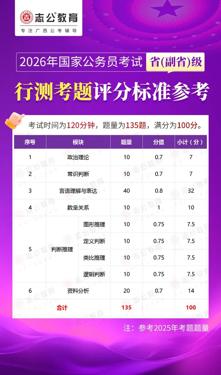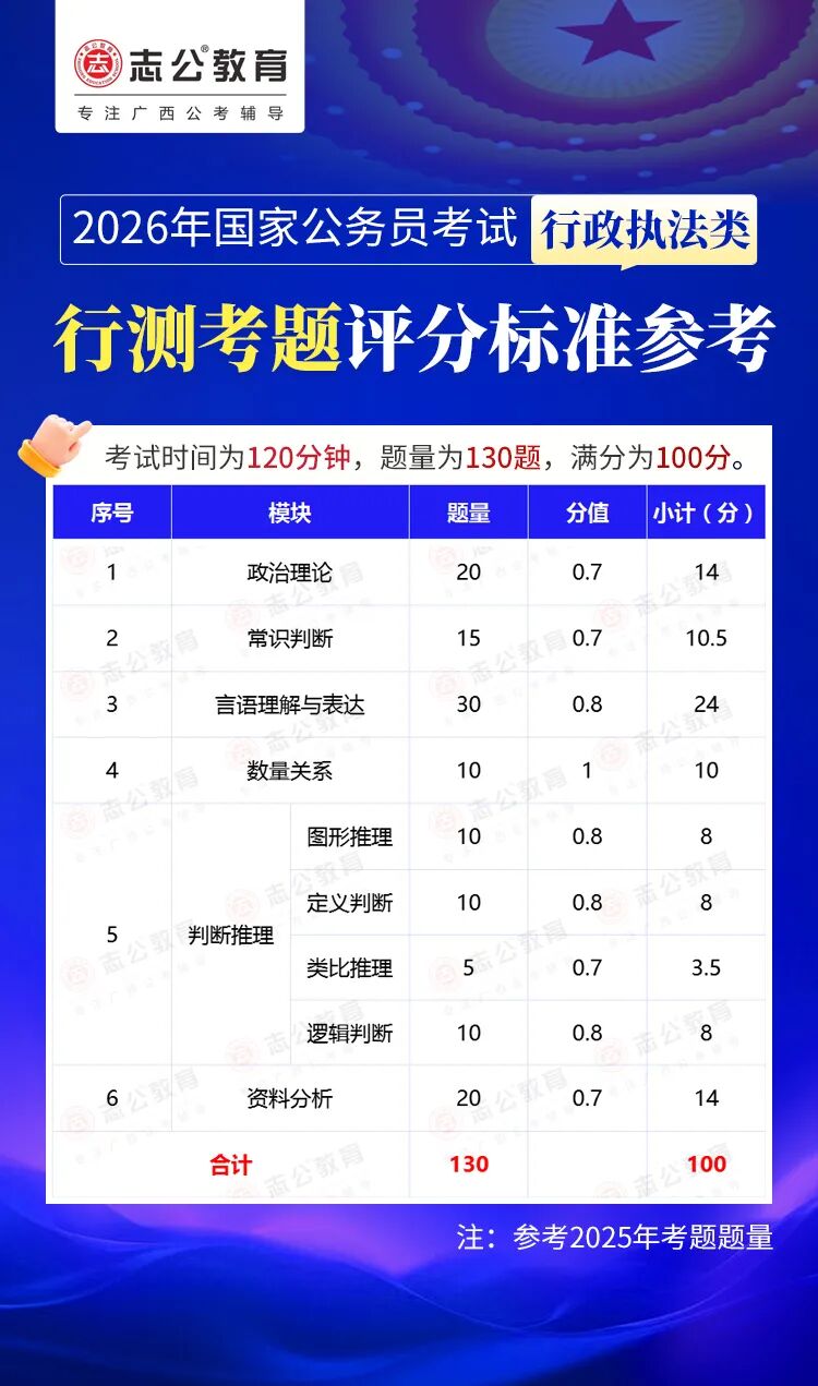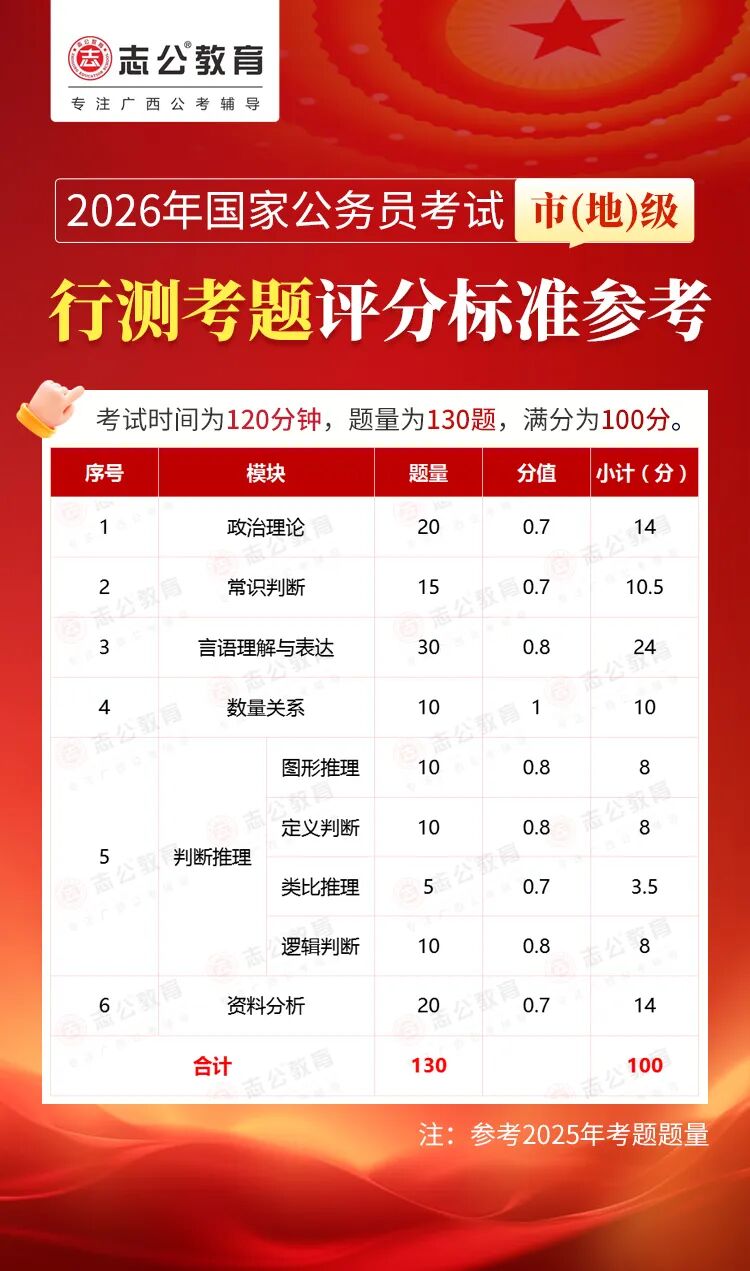 無論報名人數(shù)是否會增加,提升自身實力才是應對2026年國考的關鍵。行測作為國考公共科目筆試的核心模塊,不僅分值占比高(通常為 100 分),更是考生之間拉開分差的關鍵戰(zhàn)場。它并非單純考查知識儲備,而是通過言語理解、判斷推理、數(shù)量關系、資料分析、常識判斷、政治理論六大板塊,綜合評估考生的信息處理速度、邏輯思維能力、應急決策水平等綜合素質(zhì)。