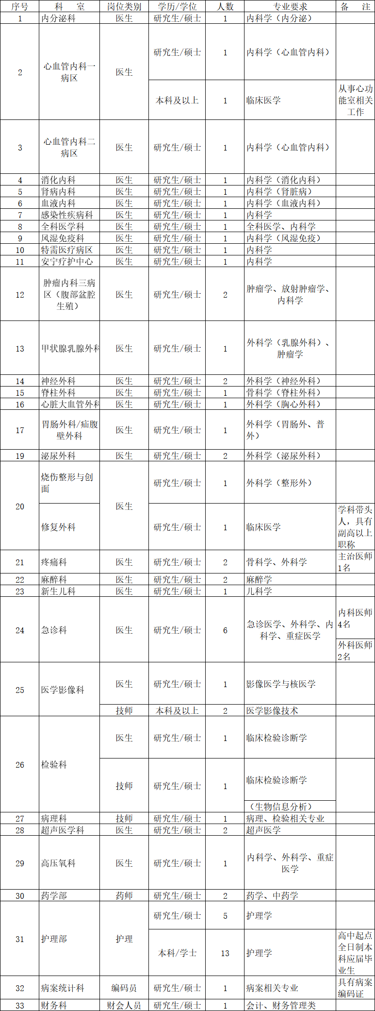 4.臨床醫(yī)師、醫(yī)技崗位人員要求35周歲以下,博士及急需緊缺專業(yè)條件可適當(dāng)放寬;護(hù)理人員要求為應(yīng)屆畢業(yè)生,25周歲及以下,碩士研究生及以上學(xué)歷者可放寬年齡條件。